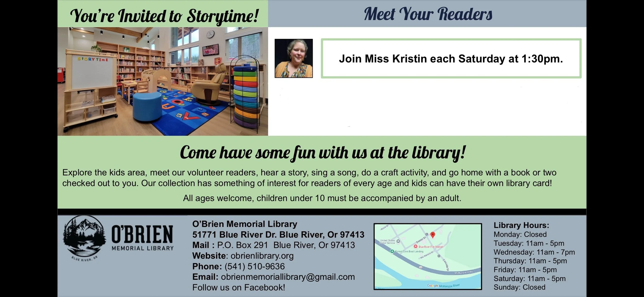 at O’Brien Memorial library, 51771 Blue River Drive, Blue River, OR 97413